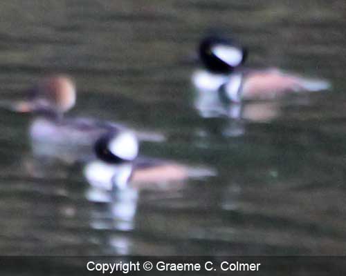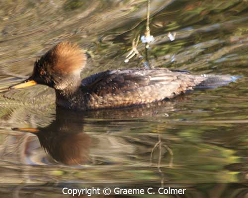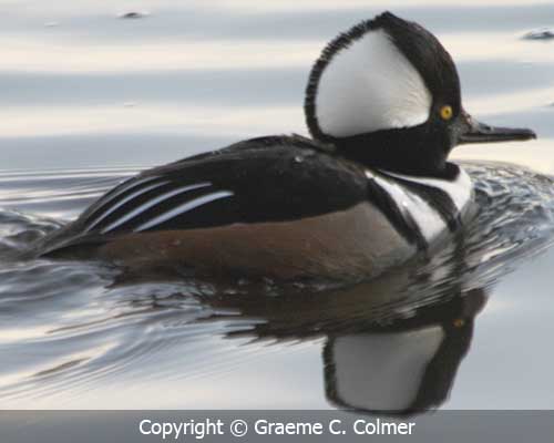 The hooded merganser is a small duck found in the northern half of the United States and southern Canada. IdentificationAdult MalesBoth males and females have a crest at the back of the head which can be expanded or contracted. In adult males, this crest has a large white patch, face and back are black with reddish-brown sides. The eyes are gold and the bill is dark with a yellow base. Adult FemalesAdult females have a reddish crest, with a grayish-brown body and head. Eyes are brownish buff. Uper bill is blackish green. Lower bill is orange or yellow. ImmatureJuveniles are similar to adult females. First year males may have a white crest path. GalleryRelated Page Hierarchy Kingdom: Animalia (animals) Class: Aves (birds) Order: Anseriformes (waterfowl) Family: Anatidae (ducks, geese, swans) Hooded merganser (Lophodytes cucullatus) |