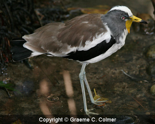 Adult male and female, and juvenile White-headed lapwings are all similar in plumage. Wings and tail are patterned in black and white, the back is brown and the underparts white. The head is mainly grey with a white crown and foreneck. The eyering, facial wattles and legs are yellow.