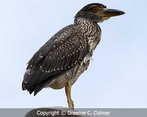 The Yellow-crowned night-heron is a nocturnal heron found throughout most of the Americas especially in warmer coastal regions. IdentificationThe yellow-crowned night-heron is a medium-sized rather stocky heron. AdultsThe adult male and female are similar in appearance. They have a black face and bill, with a white cheek, a yellowish crown stripe, gray body and yellow legs. ImmatureImmature birds are brown with tiny white spots on the wings and narrow indistinct streaks on the underparts. The bill isblack. GalleryRelated Page Hierarchy Kingdom: Animalia (animals) Class: Aves (birds) Family: Ardeidae (herons) Yellow-crowned night-heron (Nyctanassa violacea) |
