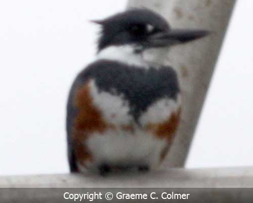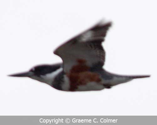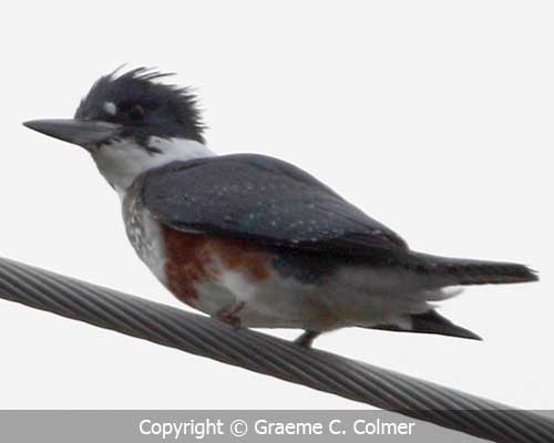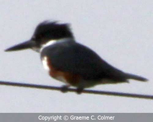 The belted kingfisher is a large water kingfisher and the only member of that family found in the Northern United States and Canada. IdentificationBelted kingfishers are a medium-sized bird with large head and shaggy crest, large thick bill. They have bluish head and back, white throat and collar, white underneath with blue breast band. Adult MalesAdult male belted kingfishers have a white belly, without the rufous band of the females. May have rufous flanks and some reddish in blue chest band. Adult FemalesAdult female belted kingfishers have rufous flanks and band across the chest below the blue band. Also rufous tips to feathers in blue chest band. ImmatureImmature birds are similar in appearance to the adults, but males have incomplete rufous chest bands. GalleryRelated Page Hierarchy Kingdom: Animalia (animals) Class: Aves (birds) Family: Cerylidae (water kingfisher) Belted kingfisher (Megaceryle alcyon) |