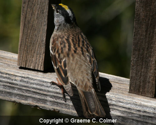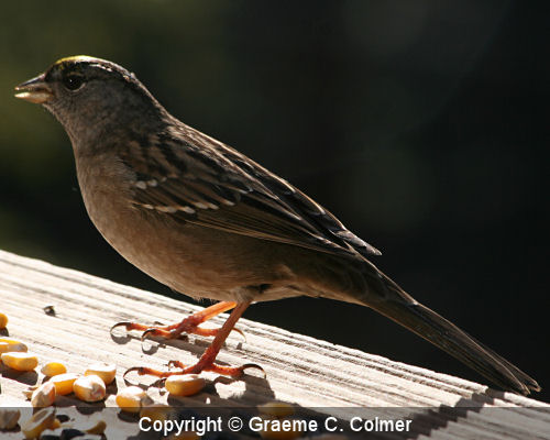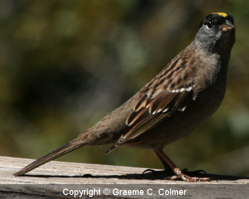 The golden-crowned sparrow is an medium-sized American sparrow in the family Emberizidae. It breeds in north-western Canada and Alaska. In the winter they migrate to the southern West coast of Canada and the West Coast of the United States. IdentificationAdultsAdult male and female golden-crowned sparrows are similar in appearance. In the breeding season, adult golden-crowned sparrows have a gold stripe flanked by two black stripes on their crown. At other times of the year the gold and black stripes are dull. ImmatureImmature birds are similar to the adults but with dull gold and black stripes. GalleryRelated Page Hierarchy Kingdom: Animalia (animals) Class: Aves (birds) Family: Emberizidae (American sparrows) Golden-crowned sparrow (Zonotrichia atricapilla) |