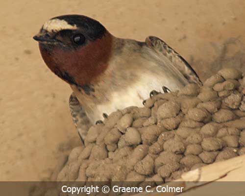 The cliff swallow is a passerine bird of the swallow and martin family. They breed in North America and migrates in winter to western South America from Venezuela southwards to northeast Argentina. They nest in large colonies in gourd-shaped mud nests on buildings, cliffs, and under bridges. IdentificationAdultsAdult male and female sage cliff swallows are similar in appearance. They have an iridescent blue back and crown, long and pointed brown wings and brown square-ended tail, and buff rump. The nape and forehead are white. The underparts are white except for a red face. ImmatureImmature birds are similar in appearance to adults but have brown instead of blue-black on the crown and back and variable dark or pale throat and forehead. GalleryRelated Page Hierarchy Kingdom: Animalia (animals) Class: Aves (birds) Family: Hirundinidae (swallows) Cliff swallow (Petrochelidon pyrrhonota) |