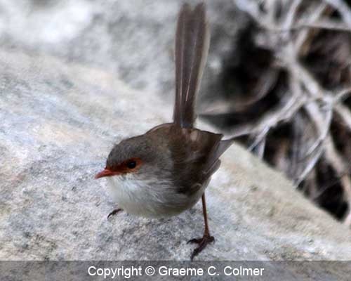The Superb fairy-wren is a small, common passerine bird found across south-eastern Australia. IdentificationAdult MalesAdult males in breeding plumage have a bright blue forehead, ear coverts, mantle and tail, brown wings, and black throat, eye band, breast and bill. Non-breeding males are a plain fawn colour with a lighter underbelly and a dull greyish blue tail. Males have a black bill. Adult FemalesAdult females are a plain fawn colour and have a dull red-orange area around the eye and a brown bill. ImmatureJuveniles are similar to adult females. GalleryRelated Page Hierarchy Kingdom: Animalia (animals) Class: Aves (birds) Family: Maluridae (Australian wrens) Superb fairy-wren (Malurus cyaneus) |